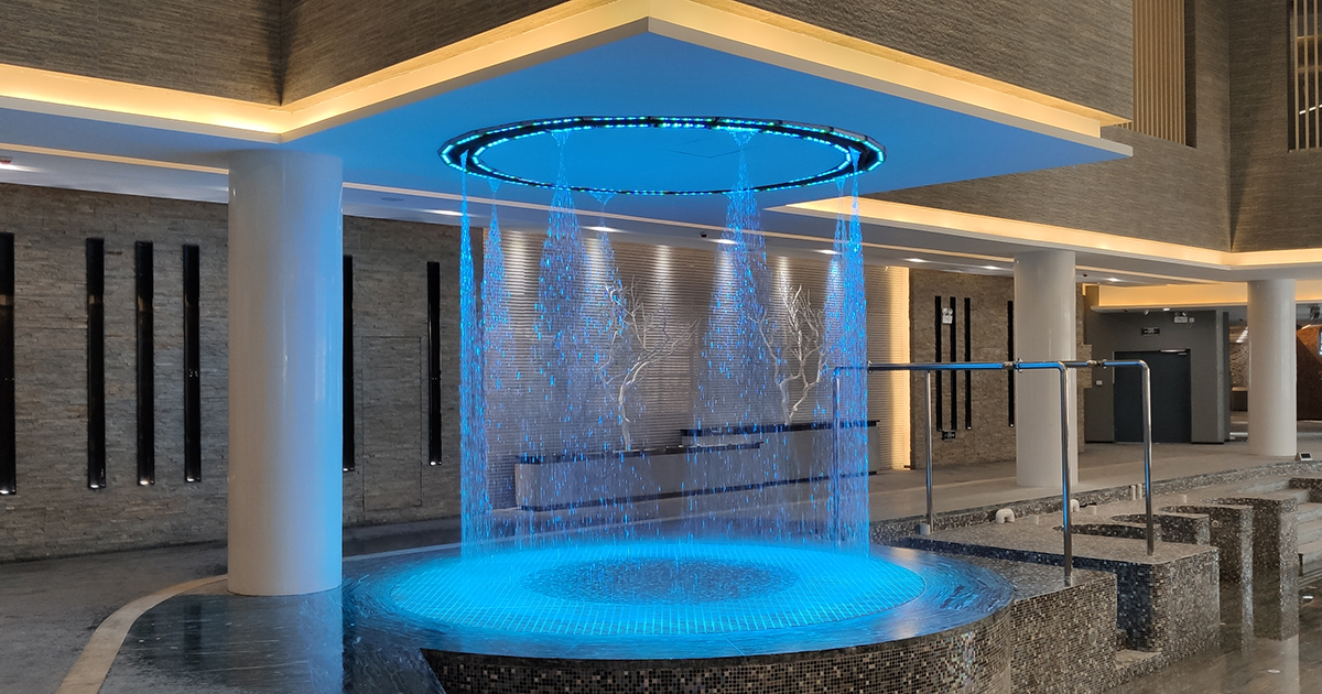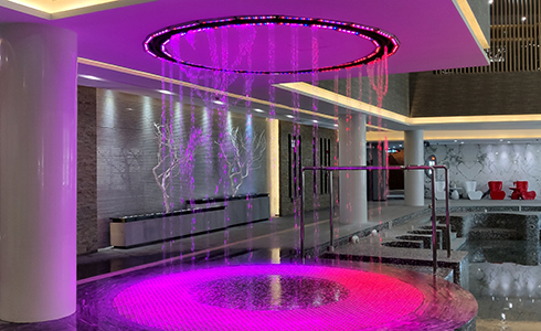 In addition to the functional properties of leisure and health, the planning and design of hot spring pays more attention to experiential, emotional, personalized and high degree of customer participation. There is a circular water curtain with a diameter of 3 meters and a circumference of 9.4 meters in the indoor comprehensive spa, and a 3.2-meter two-person water swing has in the outdoor children's play area, so that customers can not only deeply experience the health and nourishment of the hot spring, but also further perceive and experience the water.
